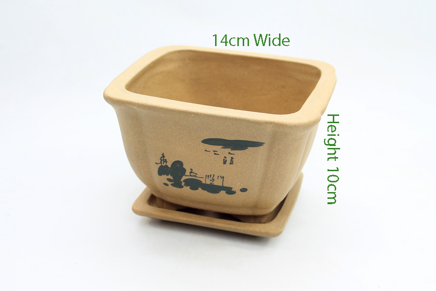 A ceramic bonsai tree pot with drainage holes. Sizes displayed are external dimensions.